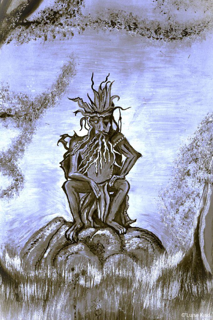Der Beschützer des Waldes blickt nachdenklich, der Erddrache hält noch still.