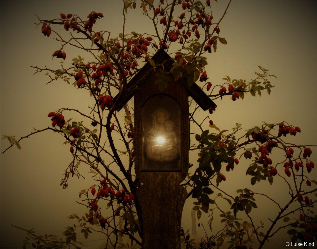Ein Bildstöckle am Wegesrand im Oktobernebel